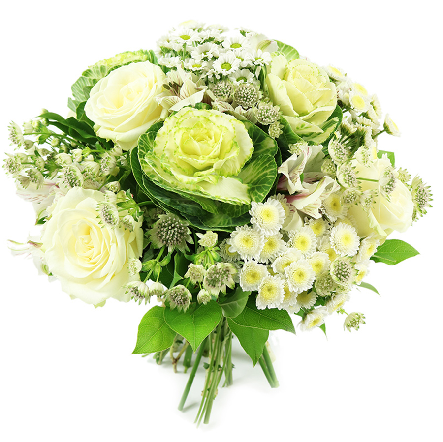 Enhance your special occasions with our elegant bouquet, featuring fresh white roses, lovely chamomile, and vibrant greenery. This unique arrangement exudes sophistication and charm.