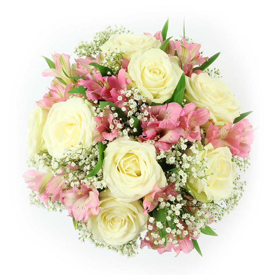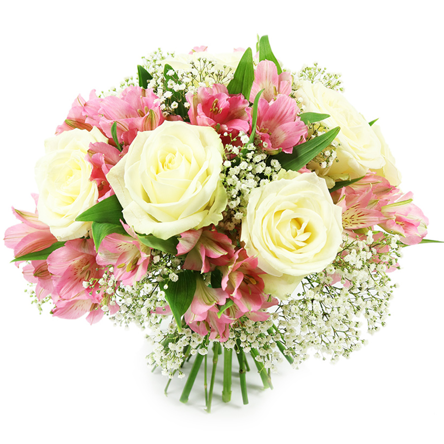Indulge in the exquisite beauty of our hand-tied bouquet, showcasing white roses, pink alstroemeria, fluffy gypsophila, and elegant greenery. Perfectly designed to enhance any setting.