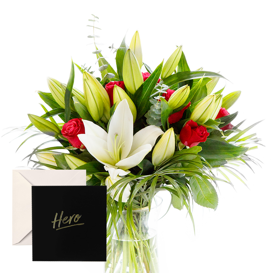 Celebrate love with our luxurious bouquet combining rich red roses and elegant white lilies, perfect for expressing your feelings on Valentine's Day.