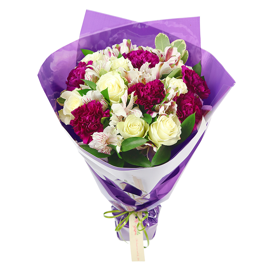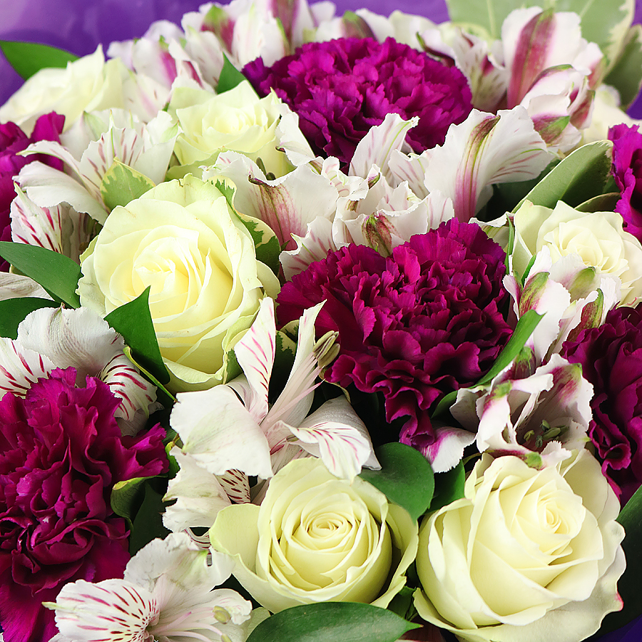 Experience the glory of summer with our Summer Glory Bouquet. This magnificent arrangement showcases radiant alstroemeria, vivid purple carnations, elegant white roses, and fresh greenery, thoughtfully combined to create a stunning display.