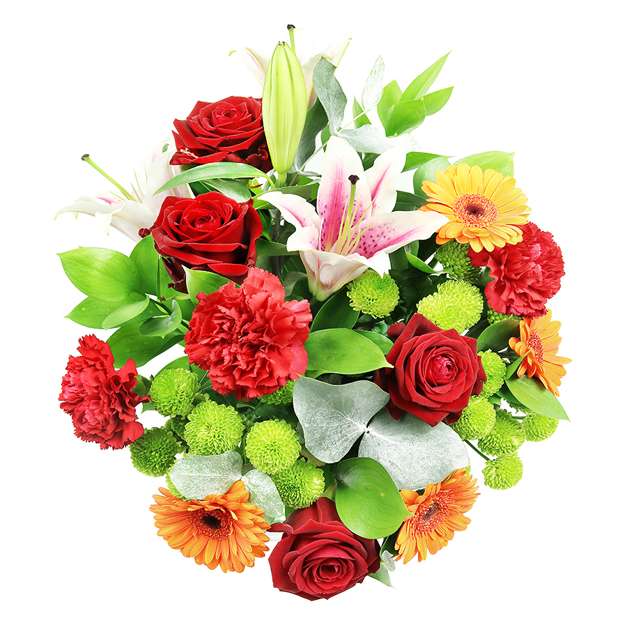 Dynamic Colors: Combines red roses, orange gerberas, pink lilies, and mini green chrysanthemums, enhanced with rich greenery for a lively presentation.
