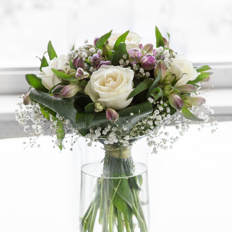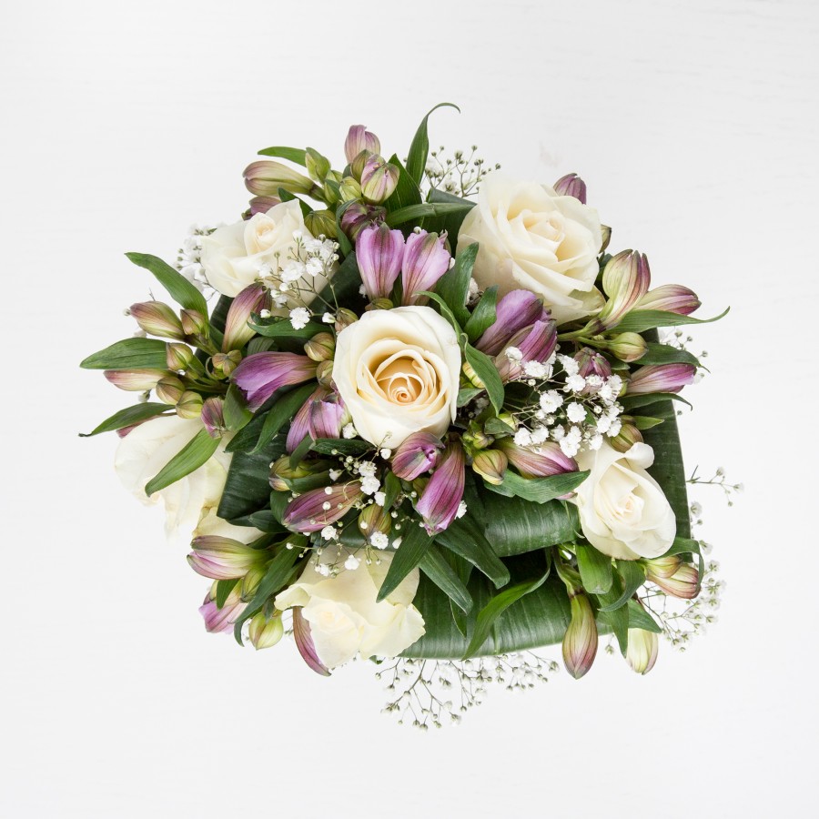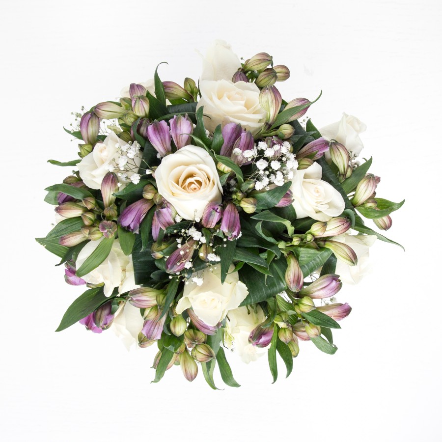 Our unique and captivating bouquet features cream ivory roses intertwined with royal purple alstroemeria, accented by white gypsophila and lush aspidistra leaves. This elegant arrangement is perfect for expressing your heartfelt sentiments.