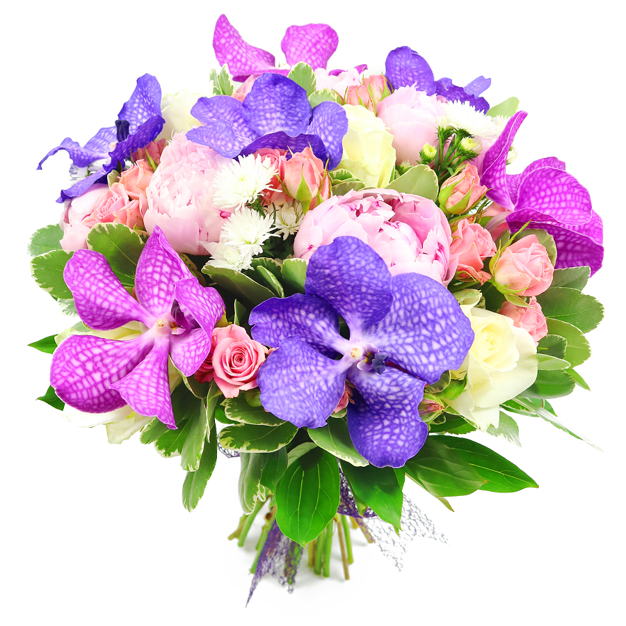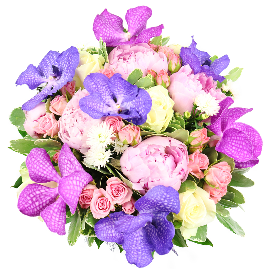 Delight in the graceful beauty of our pink and purple bouquet, featuring a captivating blend of pink vanda and purple blooms. This arrangement offers a flowy, garden-fresh aesthetic, ideal for commemorating special occasions.