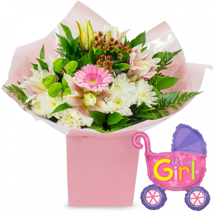 Celebrate the joyous arrival of a baby girl with our radiant bouquet featuring a delightful mix of pink and white flowers. This unique arrangement showcases the beauty of gerberas, rose lilies, and chrysanthemums, meticulously designed to enchant and uplift.