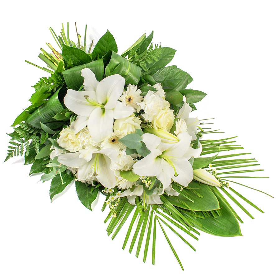 Classic white roses, carnations, liliums and gerbera are beautifully complemented by the finest white gypsophila to create this elegant spray. This heavenly beautiful flower arrangement can perfectly express your tender thoughts and memories.