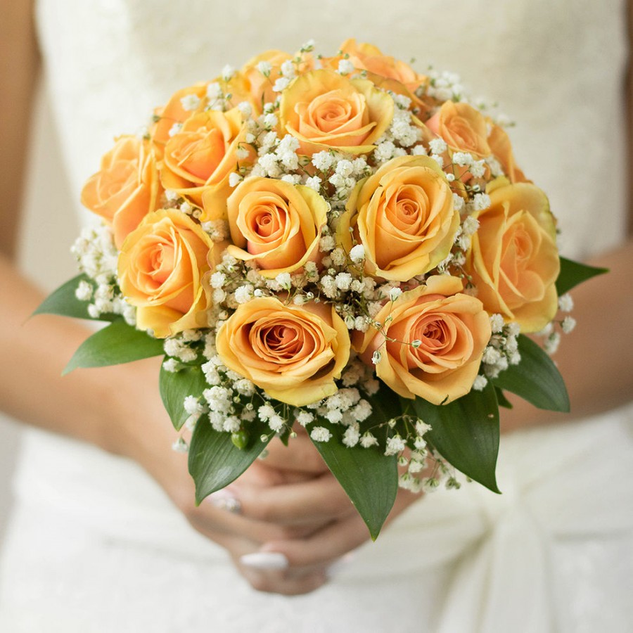 The Sound of Love Bridal Bouquet is a stunning arrangement of vibrant orange roses and delicate gypsophila, designed to add elegance and uniqueness to your wedding day. This bouquet is sure to captivate your guests and your significant other.