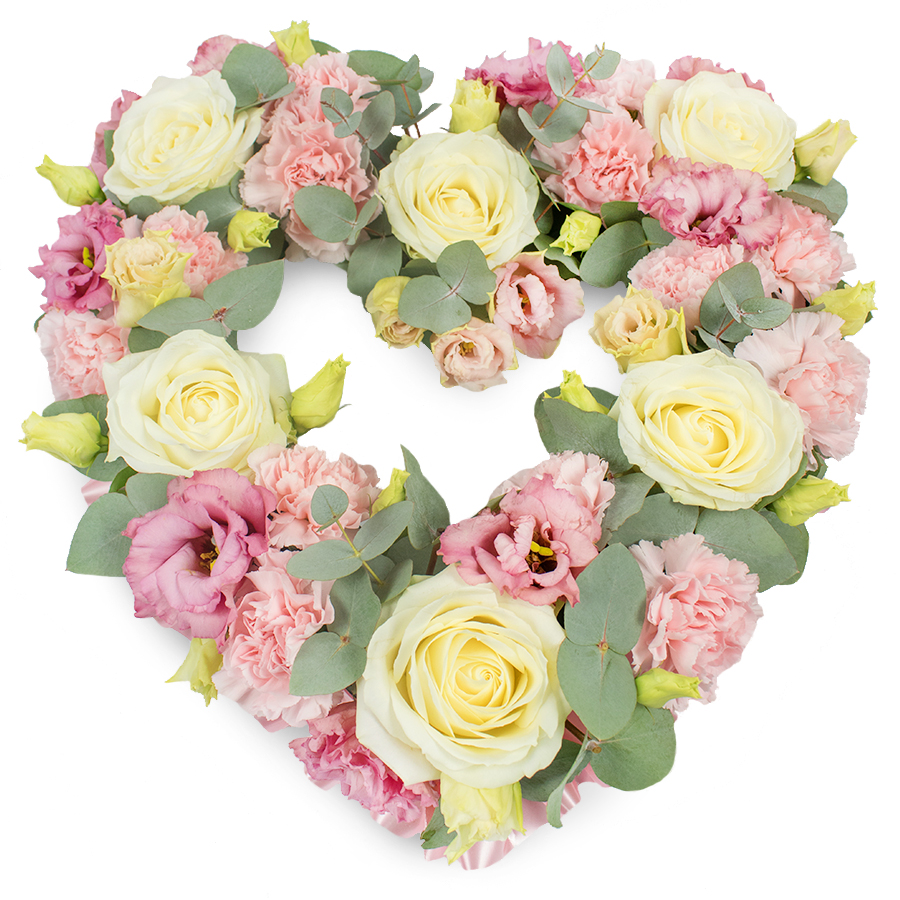 Honor and remember your loved ones with our Graceful Open Heart Remembrance Bouquet. This stunning arrangement features a delicate mix of white roses, pink carnations, pink lisianthus, and eucalyptus leaves, thoughtfully arranged to symbolize love, peace, and lasting memories.