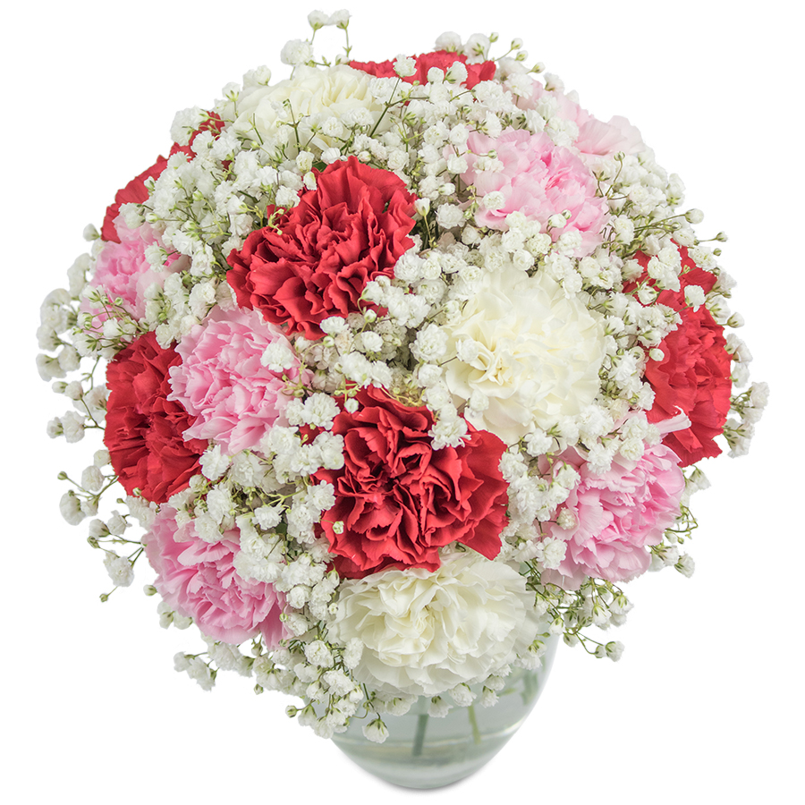 Embodying delicate beauty, our carnation bouquet features a harmonious mix of white, red, and pink carnations adorned with charming gypsophila flowers. This graceful arrangement is ideal for expressing heartfelt sentiments and adding a touch of elegance to any occasion.