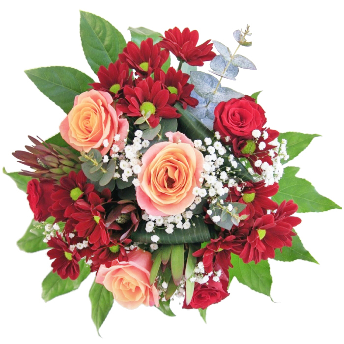 This magnificent arrangement boasts a glorious combination of sweet peach and scarlet roses, deep red spray chrysanthemums, white gypsophila, aralia leaves and eucalyptus leaves. Show someone how much you care stylishly.